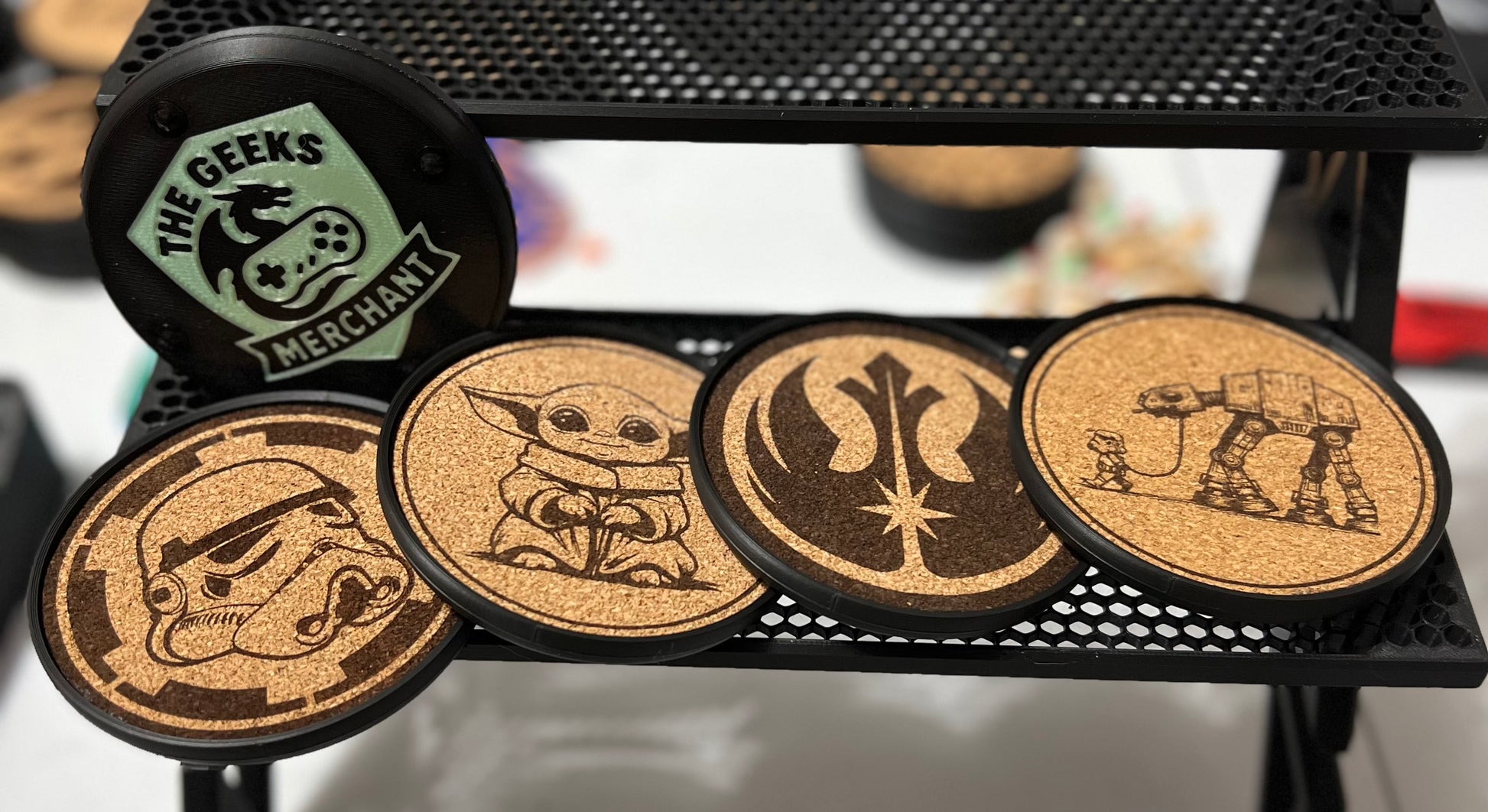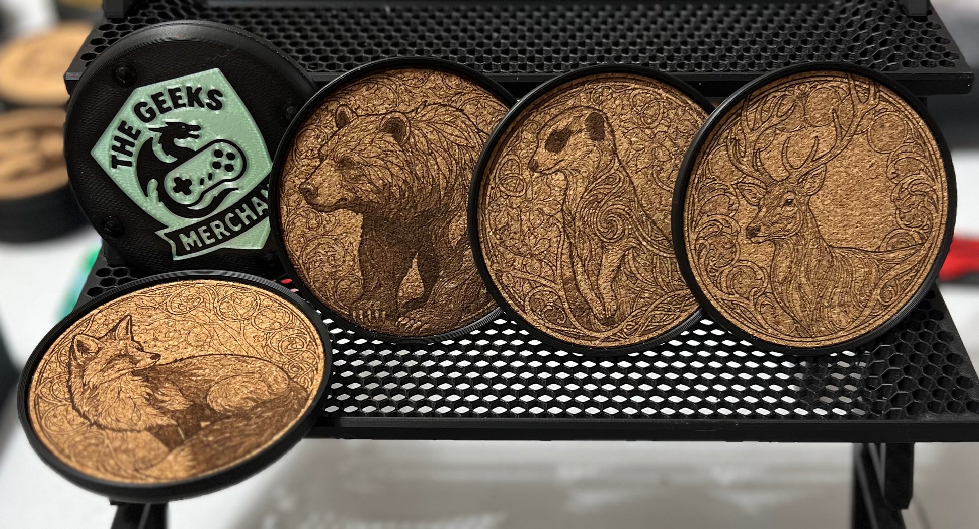 Beautifully engraved coasters in cork, that sit flush with a custom designed Geeks Merchant 3D printed coaster. The coaster has installed rubber feet for a great grip, cork on top to absorb condensation, and a beautiful logo to show off to everyone you know (wink wink).